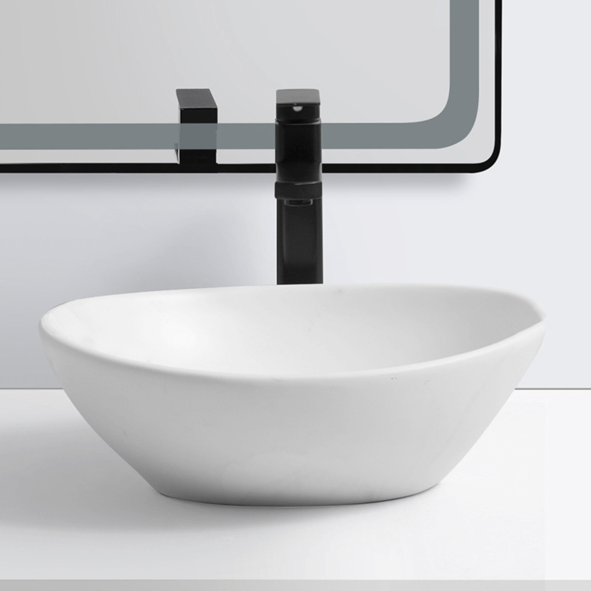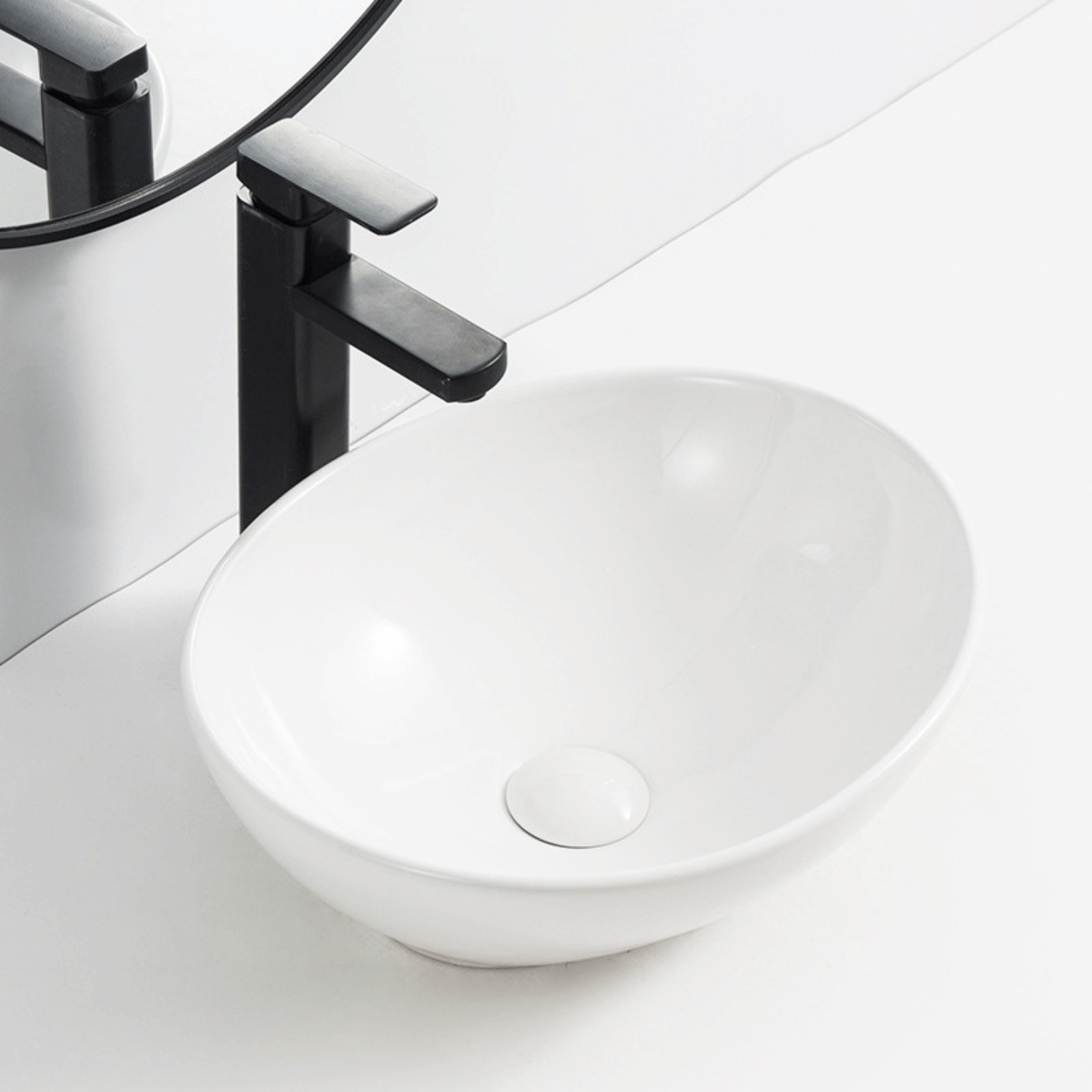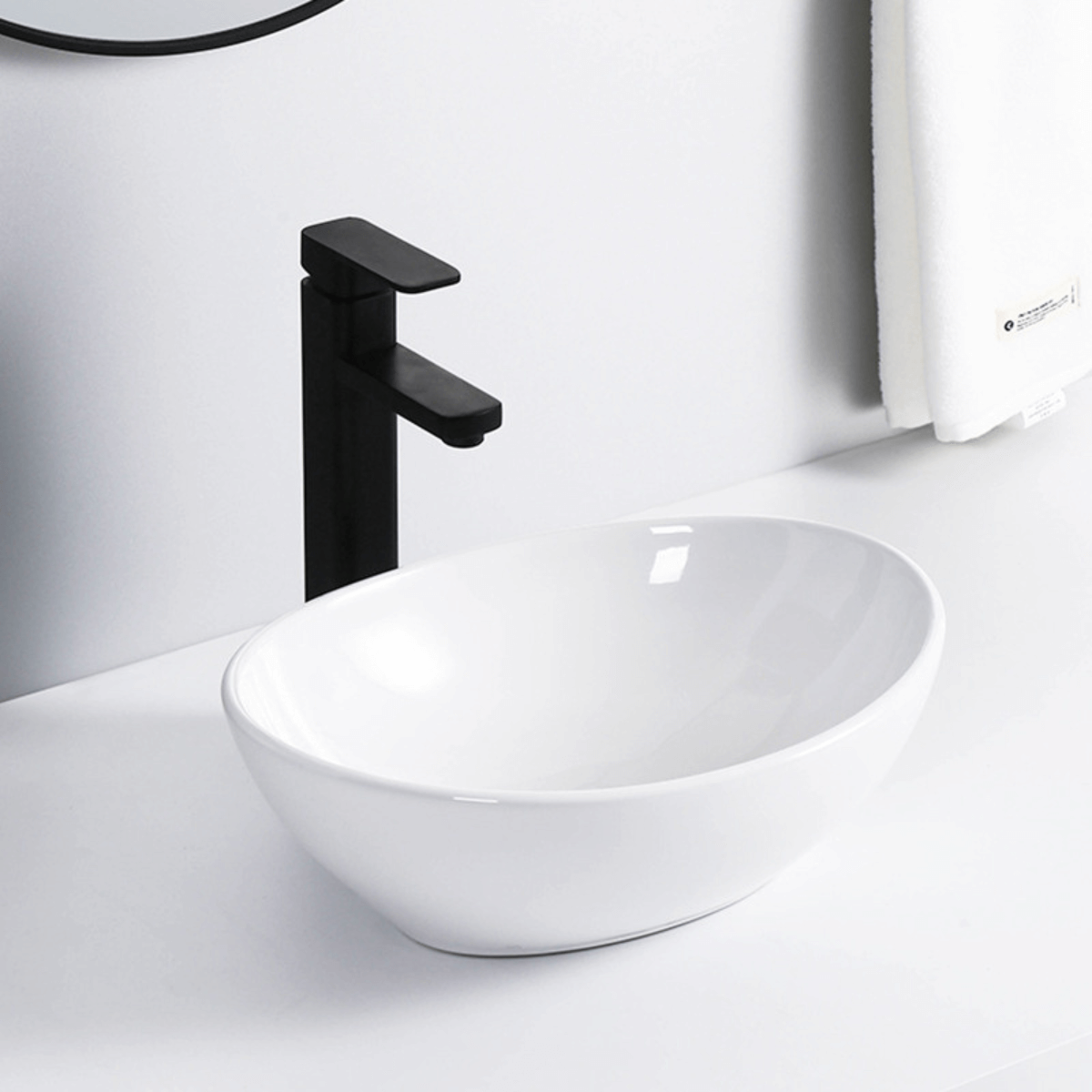 - Hình dáng chậu: Chậu có hình elip và được thiết kế dương bàn, nghĩa là chậu có thể đặt lên mặt bàn hoặc bề mặt cố định trong không gian phòng tắm.