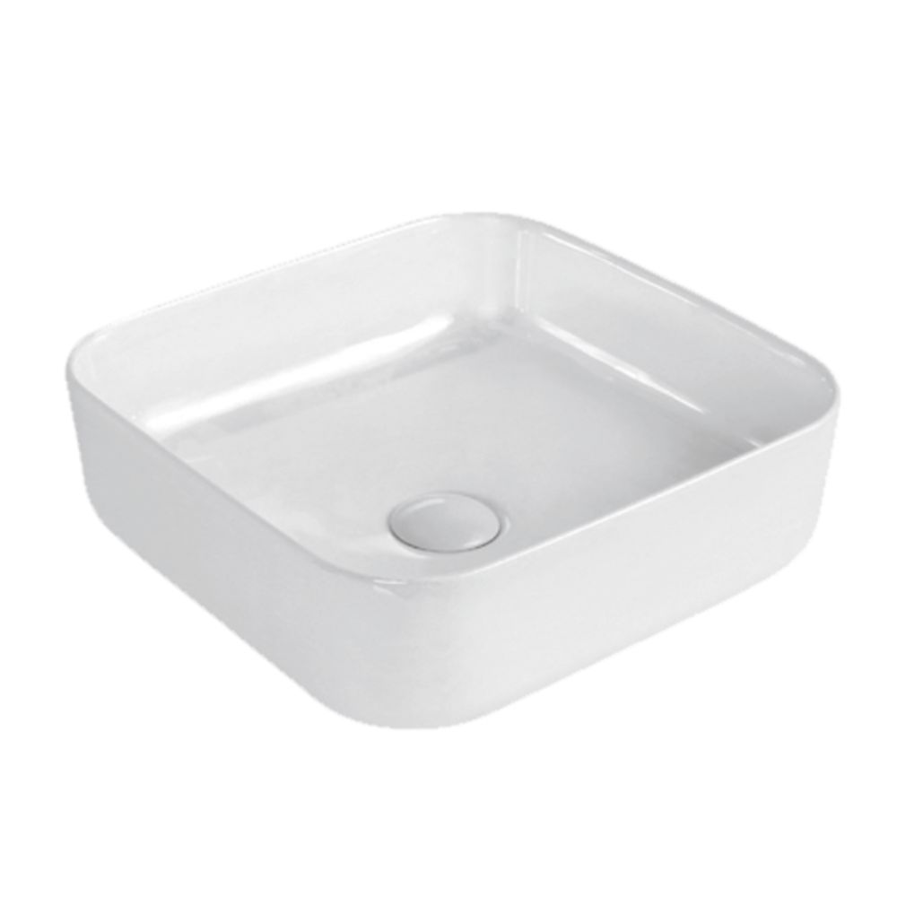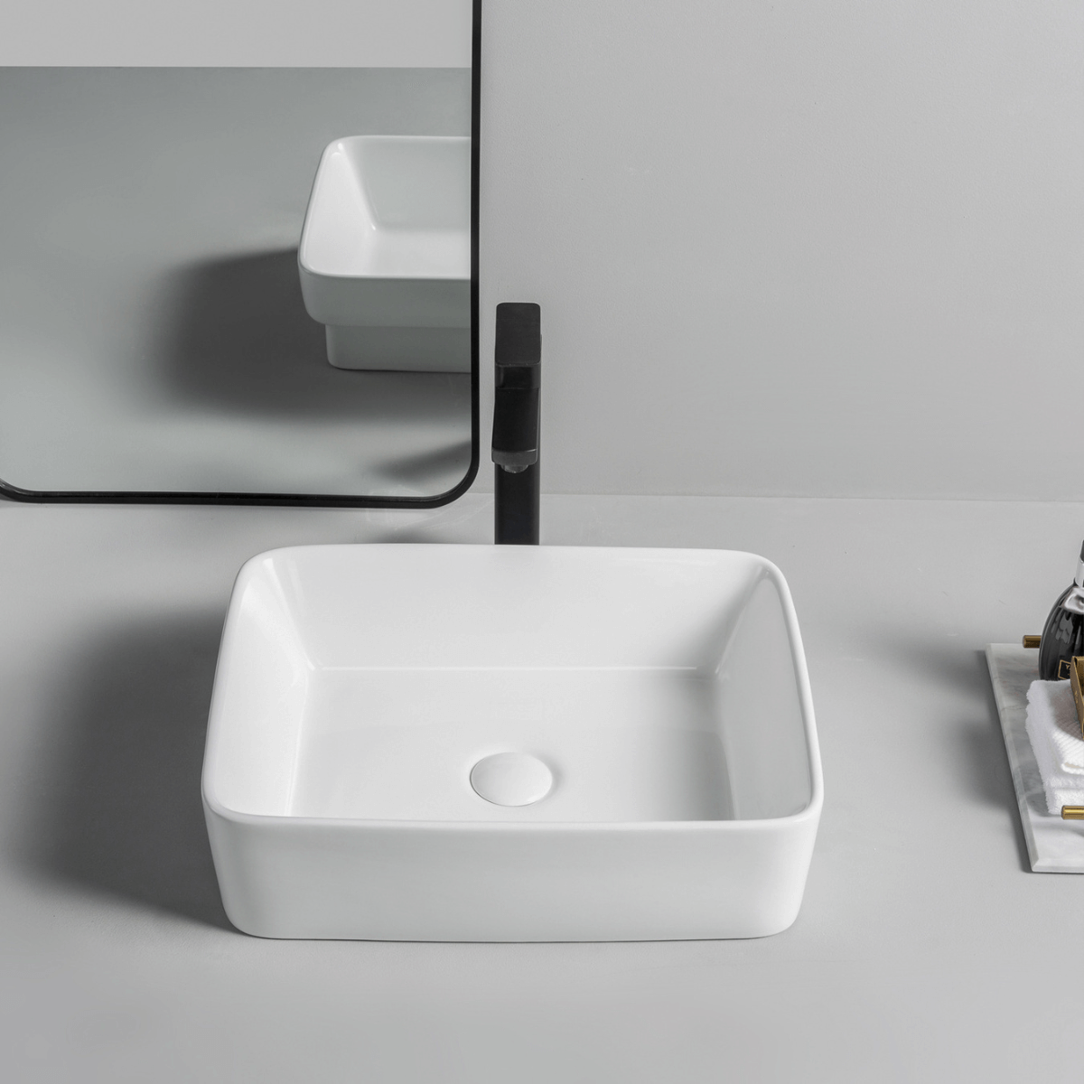 Chậu có hình chữ nhật và thiết kế dương bàn, cho phép bạn đặt nó trên bề mặt hoặc bàn trong không gian phòng tắm một cách tiện lợi