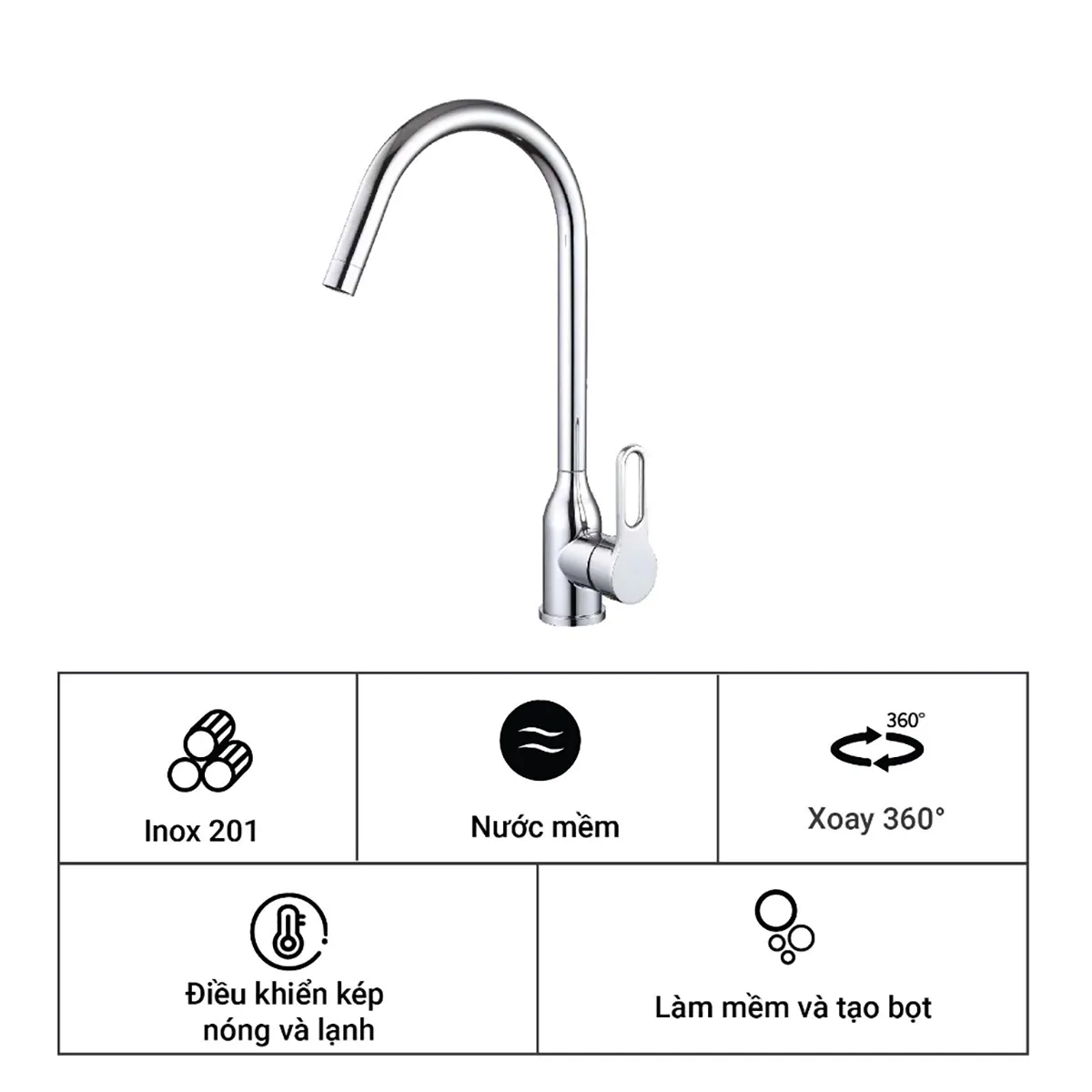 - Vòi chậu có màu chrome sang trọng, phù hợp với mọi phong cách trang trí nhà bếp.