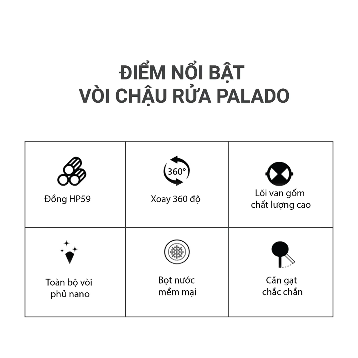 Vòi chậu rửa mặt PALADO PLD201B – Palado là thương hiệu chuyên cung cấp các sản phẩm thiết bị vệ sinh chất lượng cao, giá thành hợp lý đối với người tiêu dùng Việt Nam. Với mong muốn tạo ra những sản phẩm đem đến sự thoải mái và tiện ích tối đa dành cho người sử dụng, Palado không chỉ chú trọng vào thiết kế tinh tế, sang trọng mà còn đa dạng về mẫu mã. Cùng với đó là tiêu chí đặt chất lượng sản phẩm lên hàng đầu trong quá trình nghiên cứu phát triển sản phẩm và sản xuất.
